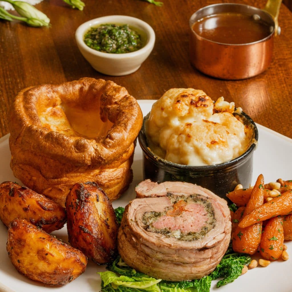Our Black Olive Tapenade & Semi Dried Tomato Stuffed Lamb Shoulder Roulade is slow cooked to perfection and served with maple glazed Chantenay carrots with toasted pine nuts, buttered Savoy cabbage, creamy cauliflower cheese, a golden Yorkshire pudding, unlimited roast potatoes and a fresh salsa verde.