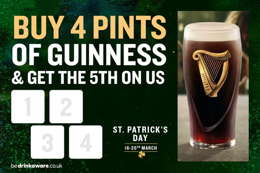 Between Monday 16th and Friday 20th March, buy 4 pints of Guinness to share at The Old Crown and we’ll get your next pint of Guinness in, totally on us.